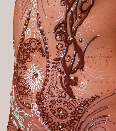 Edible body paint can also be applied using a tube, to create a detailed decorative effect. Using a tube to apply the paint means that the artist can form delicate swirls, lines and dots to give a lacy, feminine effect. Take a look at these chocolate body paintings created with paint tubes by Gerard Petzl. You can see more of his art at Forever Art.